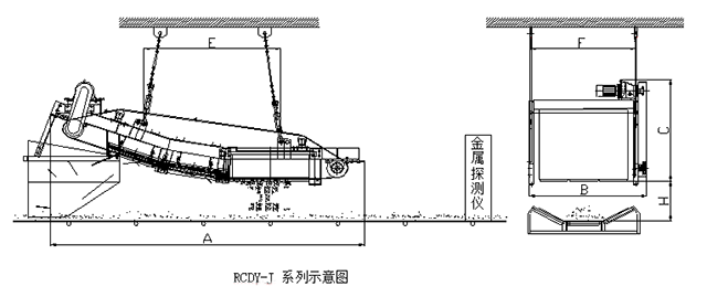 四、RCDY-J系列懸掛式組合回收型除鐵器主要技術參數、外形尺寸 執行標準:JB/T7689、JB/T10885